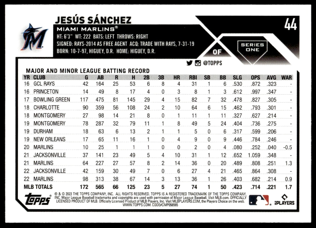 Home Β» 2023 Topps Series 1 Jesus Sanchez #44