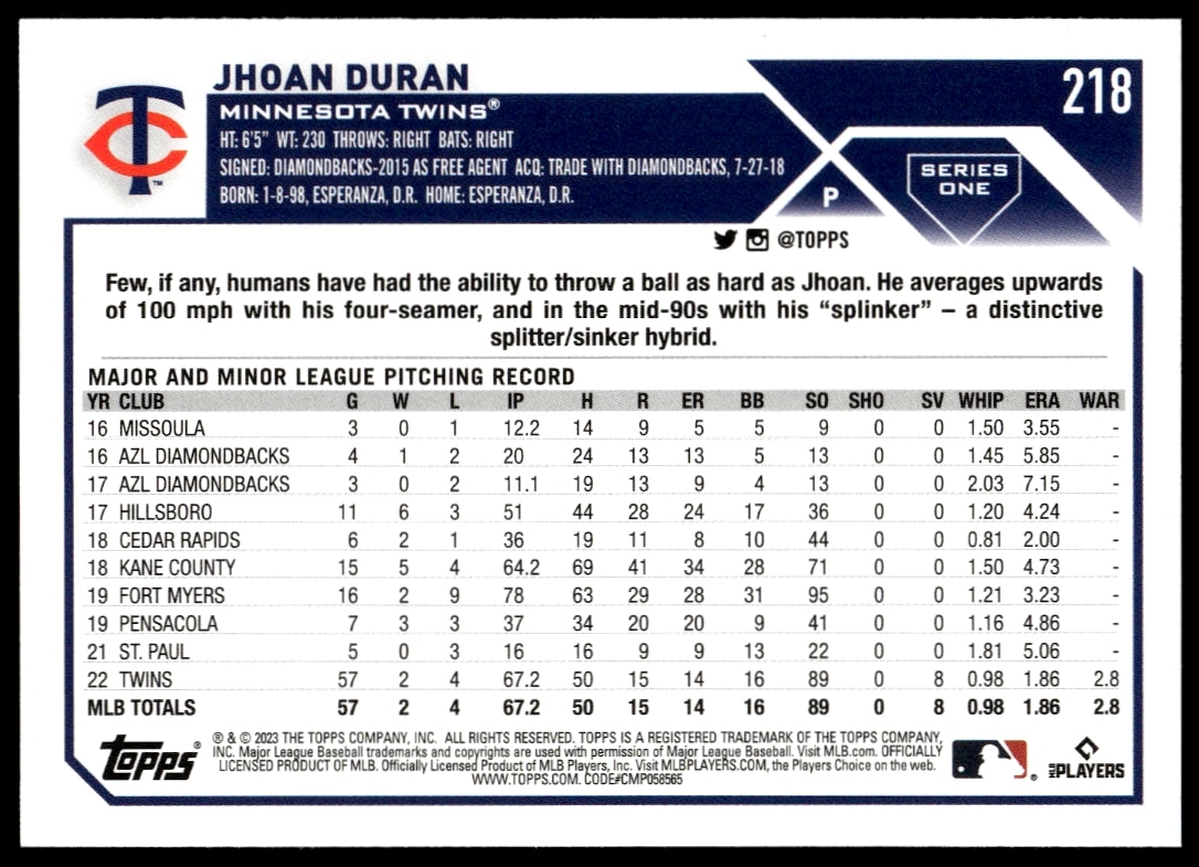 This Baseball card, from 2023 is part of the Topps Series 1 card set. Jhoan Duran is featured and has a card number of 218.