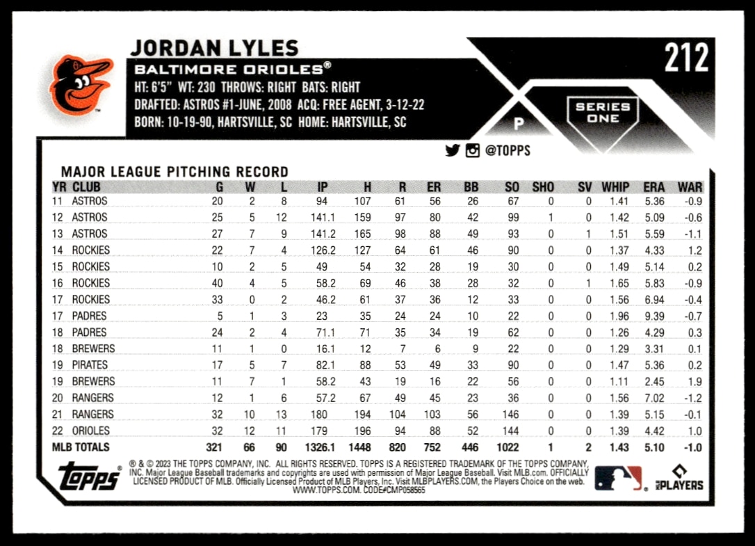 This Baseball card, from 2023 is part of the Topps Series 1 card set. Jordan Lyles is featured and has a card number of 212.