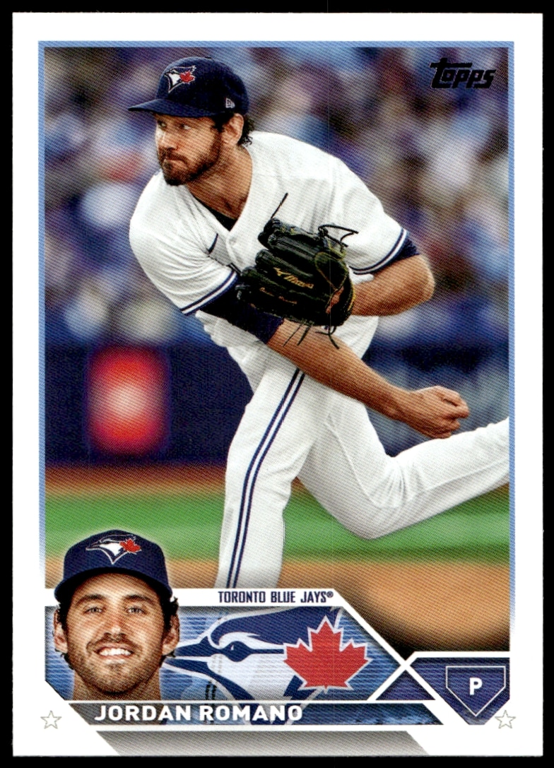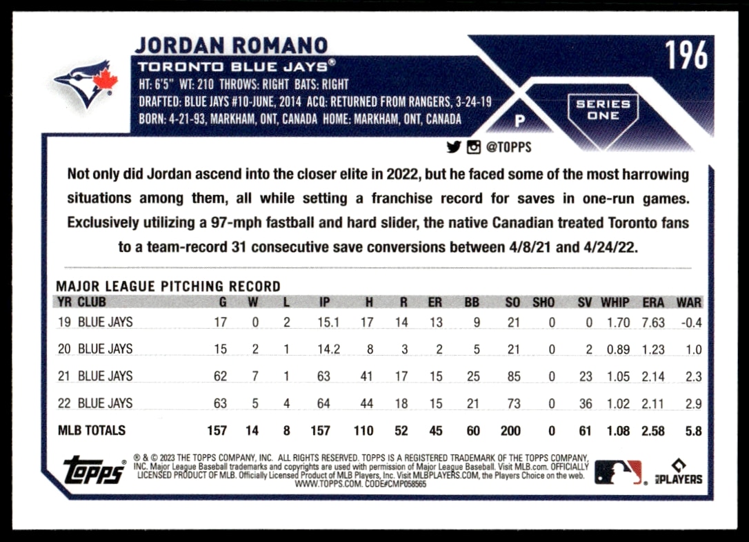 This Baseball card, from 2023 is part of the Topps Series 1 card set. Jordan Romano is featured and has a card number of 196.