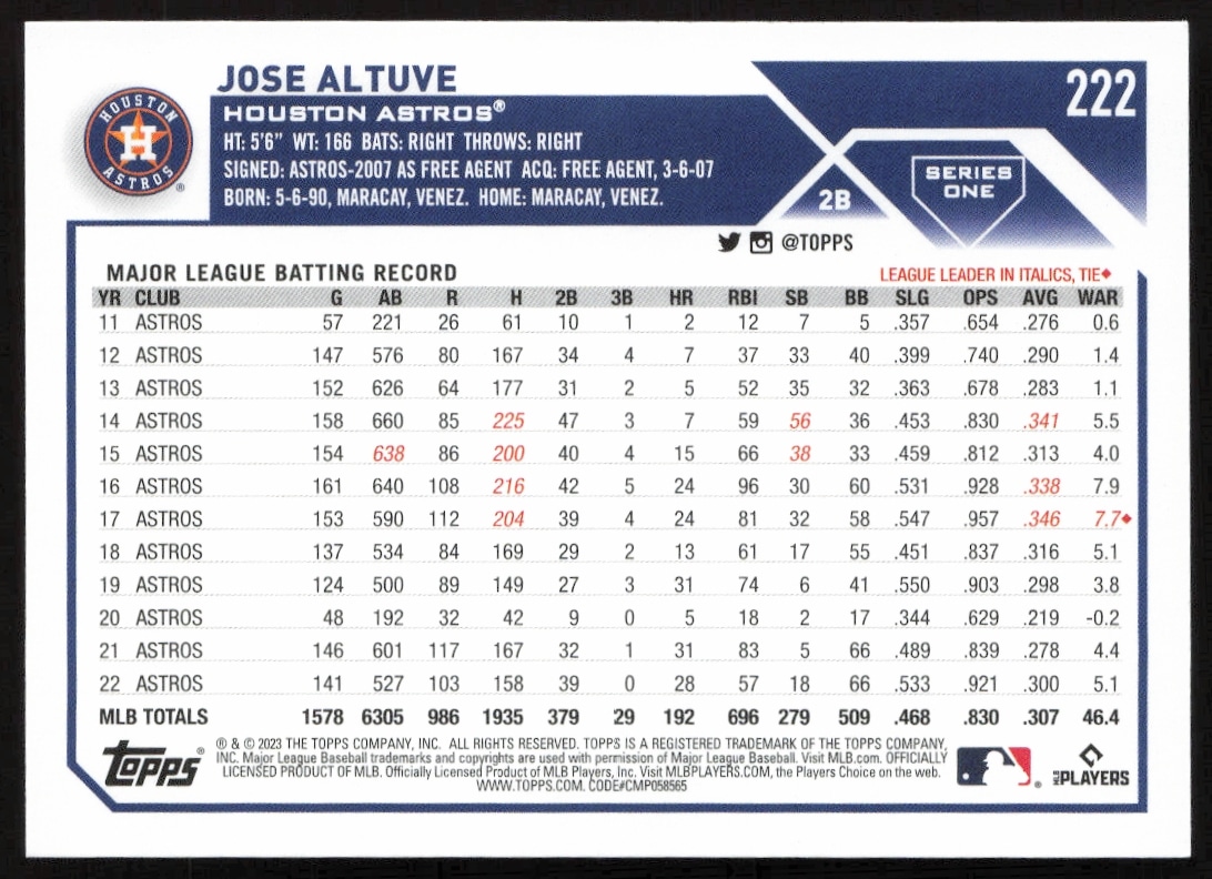 This Baseball card, from 2023 is part of the Topps Series 1 card set. Jose Altuve is featured and has a card number of 222.