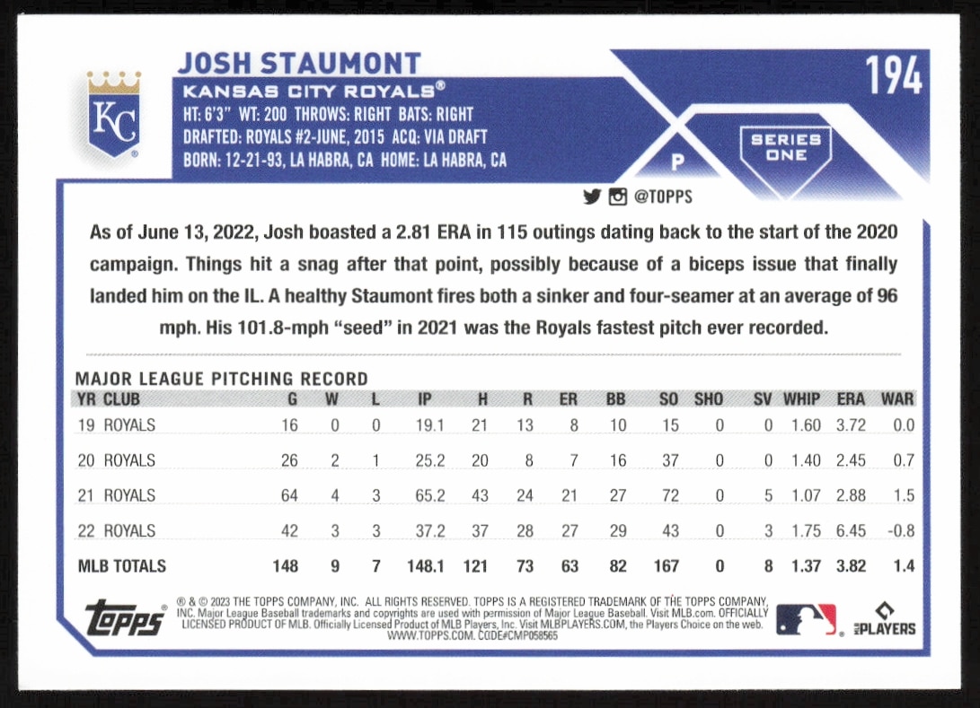 This Baseball card, from 2023 is part of the Topps Series 1 card set. Josh Staumont is featured and has a card number of 194.