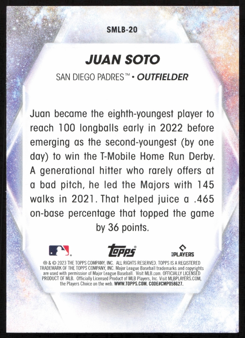 This Baseball card, from 2023 is part of the Topps Series 1 card set. Juan Soto is featured and has a card number of SMLB-20.