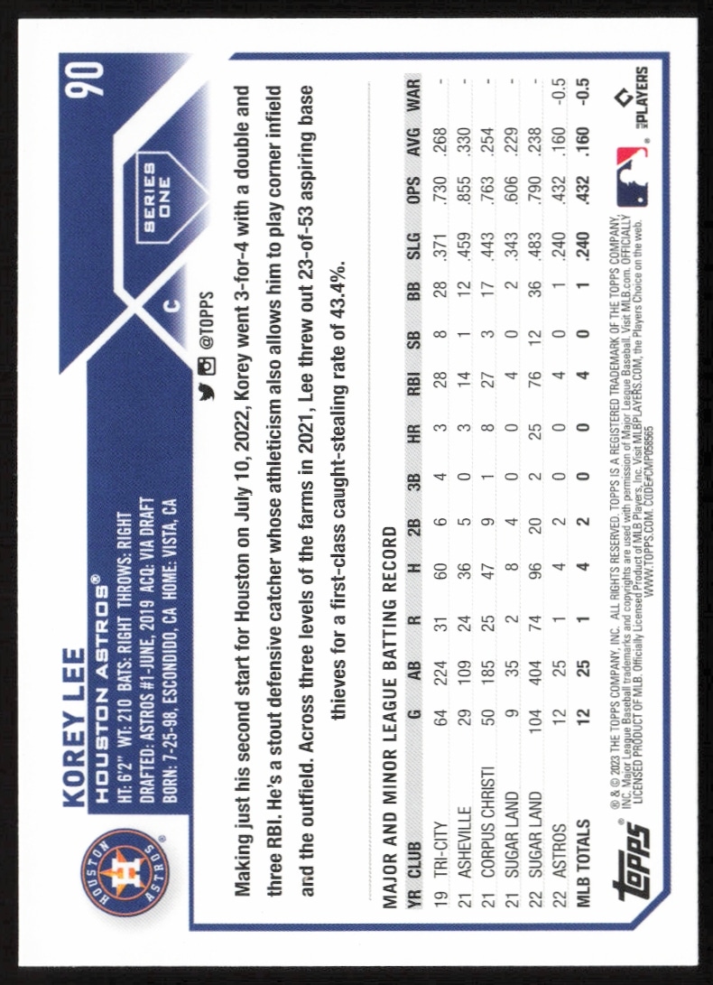 This Baseball card, from 2023 is part of the Topps Series 1 card set. Korey Lee is featured and has a card number of 90.