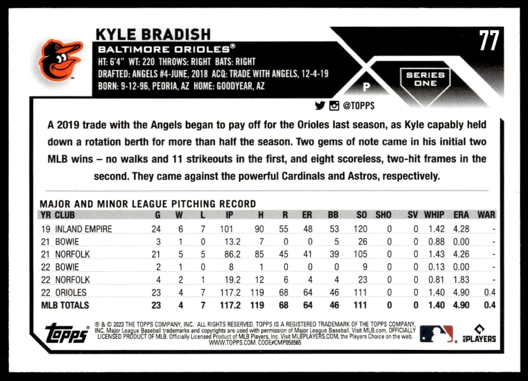 This Baseball card, from 2023 is part of the Topps Series 1 card set. Kyle Bradish is featured and has a card number of 77.