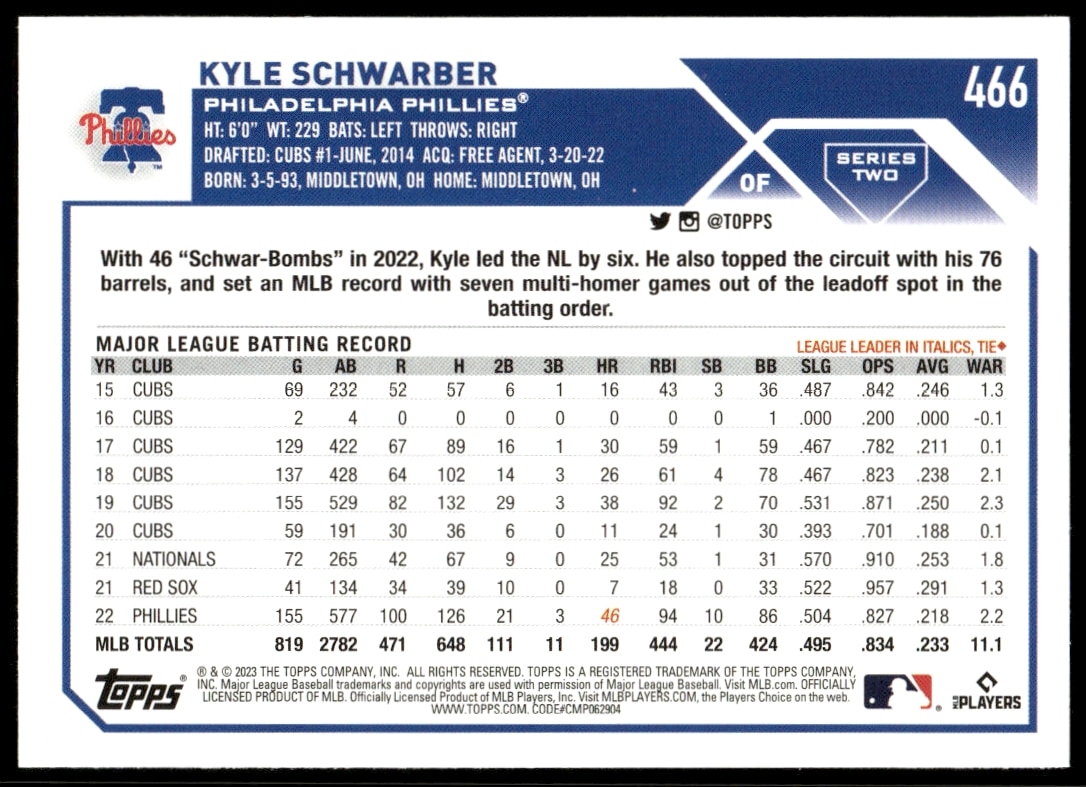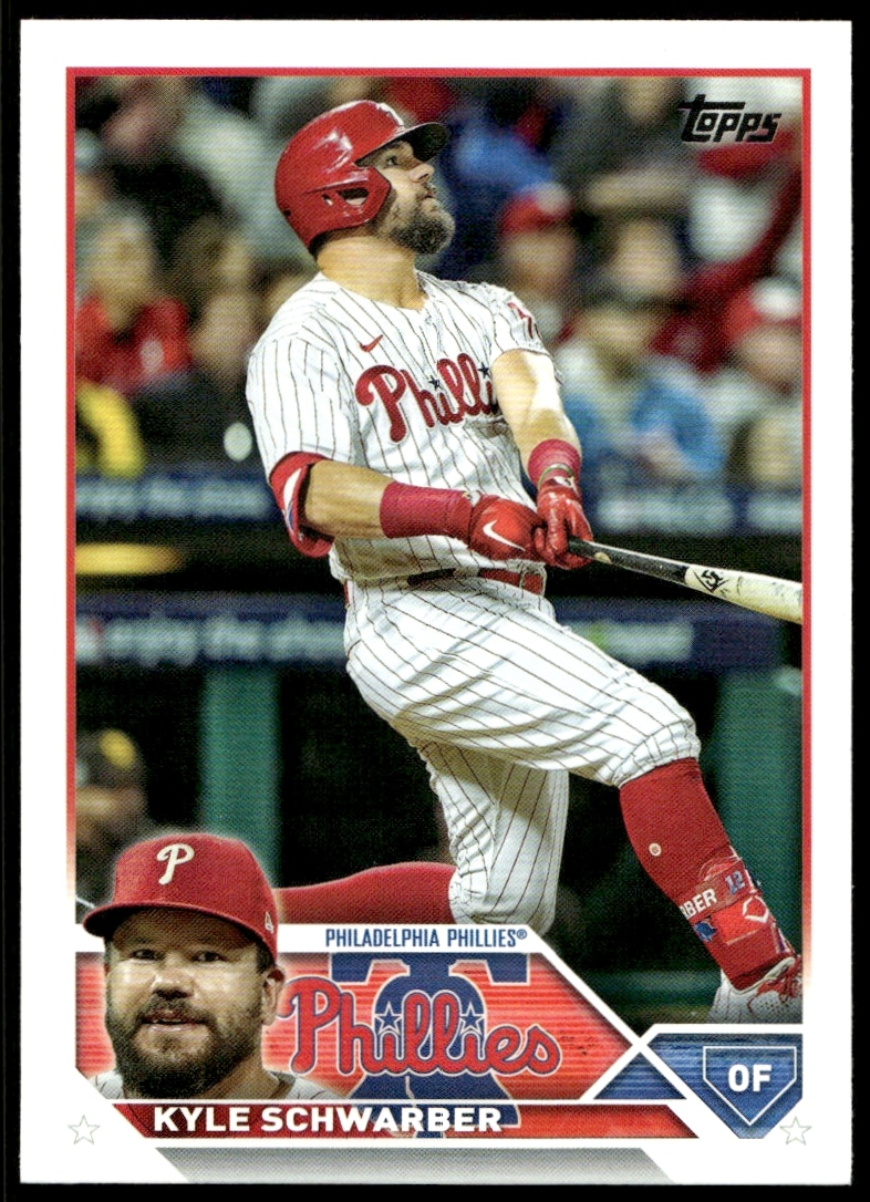This BaseballΒ card, from 2023 is part of the Topps Series 1Β card set. Kyle Schwarber is featured and has a card number of 153.