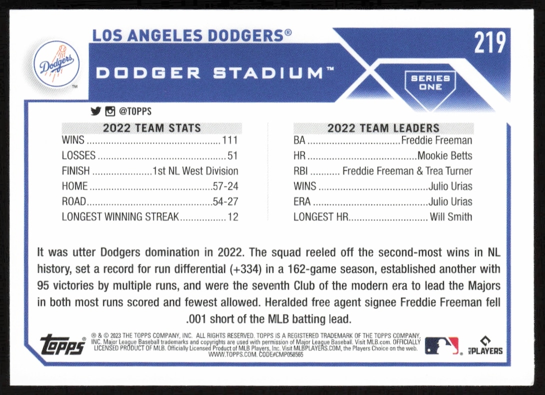 This Baseball card, from 2023 is part of the Topps Series 1 card set. Los Angeles Dodgers Team Card is featured and has a card number of 219.