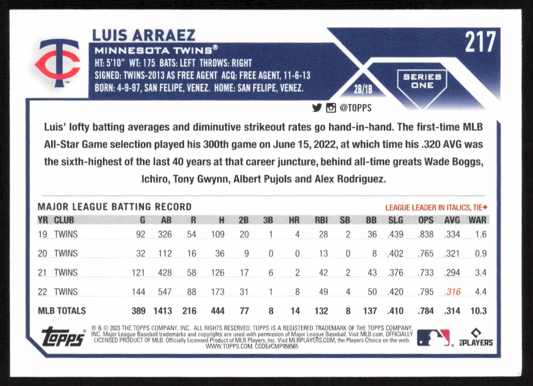 This Baseball card, from 2023 is part of the Topps Series 1 card set. Luis Arraez is featured and has a card number of 217.