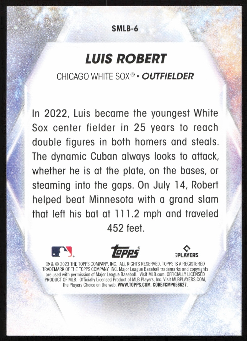 This Baseball card, from 2023 is part of the Topps Series 1 card set. Luis Robert is featured and has a card number of SMLB-6.