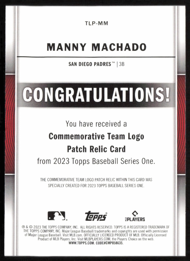 This Baseball card, from 2023 is part of the Topps Series 1 card set. Manny Machado is featured and has a card number of TLP-MM.