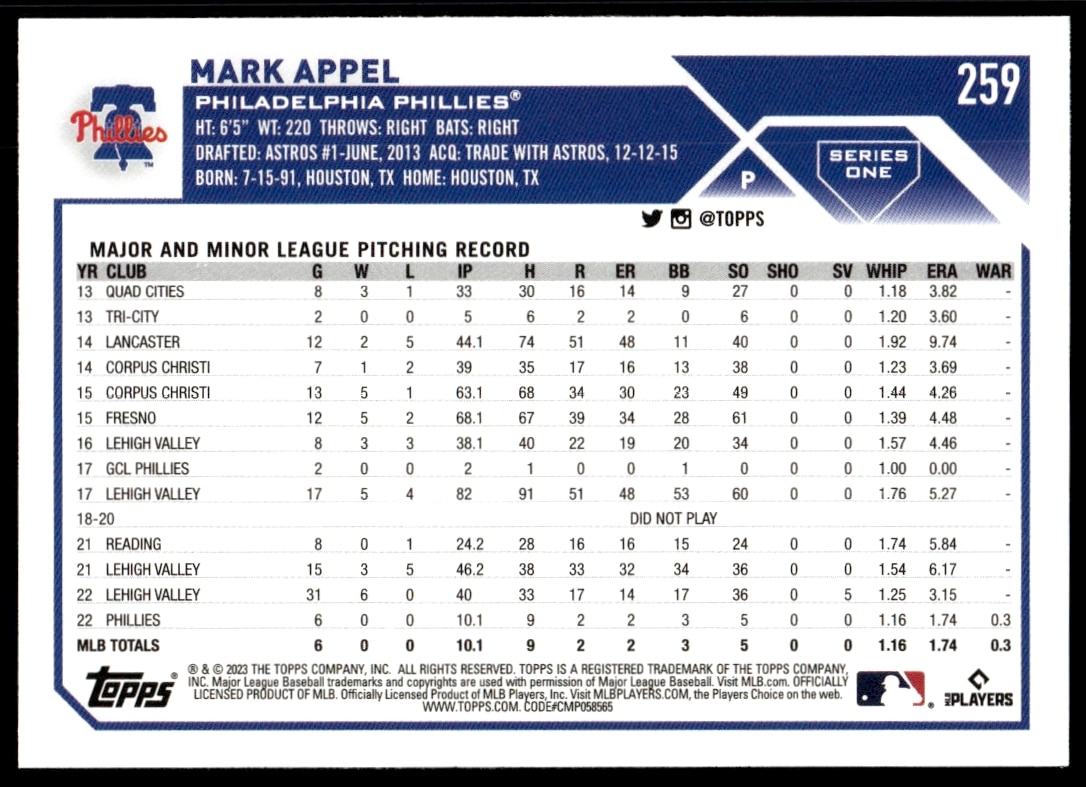 This Baseball card, from 2023 is part of the Topps Series 1 card set. Mark Appel is featured and has a card number of 259.