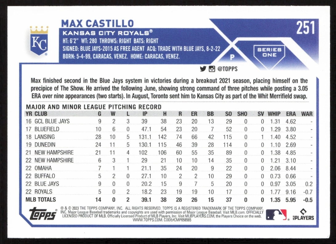 This Baseball card, from 2023 is part of the Topps Series 1 card set. Max Castillo is featured and has a card number of 251.