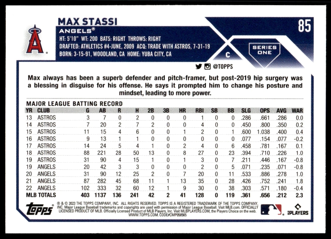 This Baseball card, from 2023 is part of the Topps Series 1 card set. Max Stassi is featured and has a card number of 85.