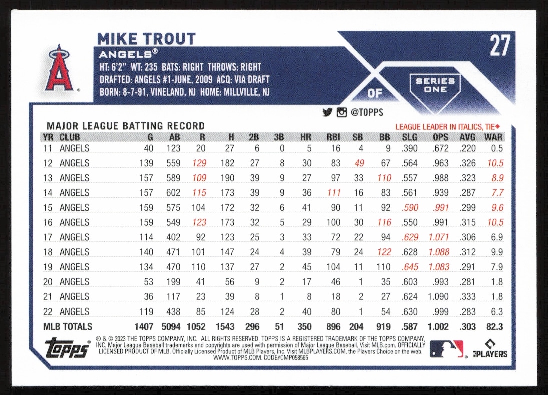 This Baseball card, from 2023 is part of the Topps Series 1 card set. Mike Trout is featured and has a card number of 27.