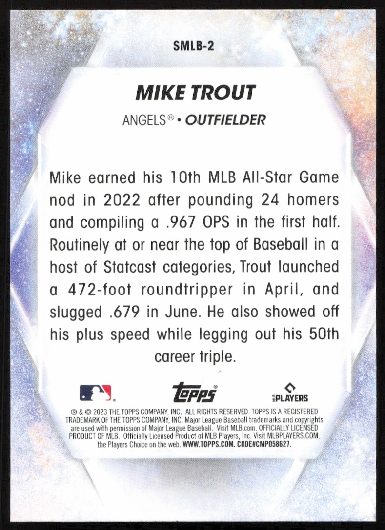 This Baseball card, from 2023 is part of the Topps Series 1 card set. Mike Trout is featured and has a card number of SMLB-2.