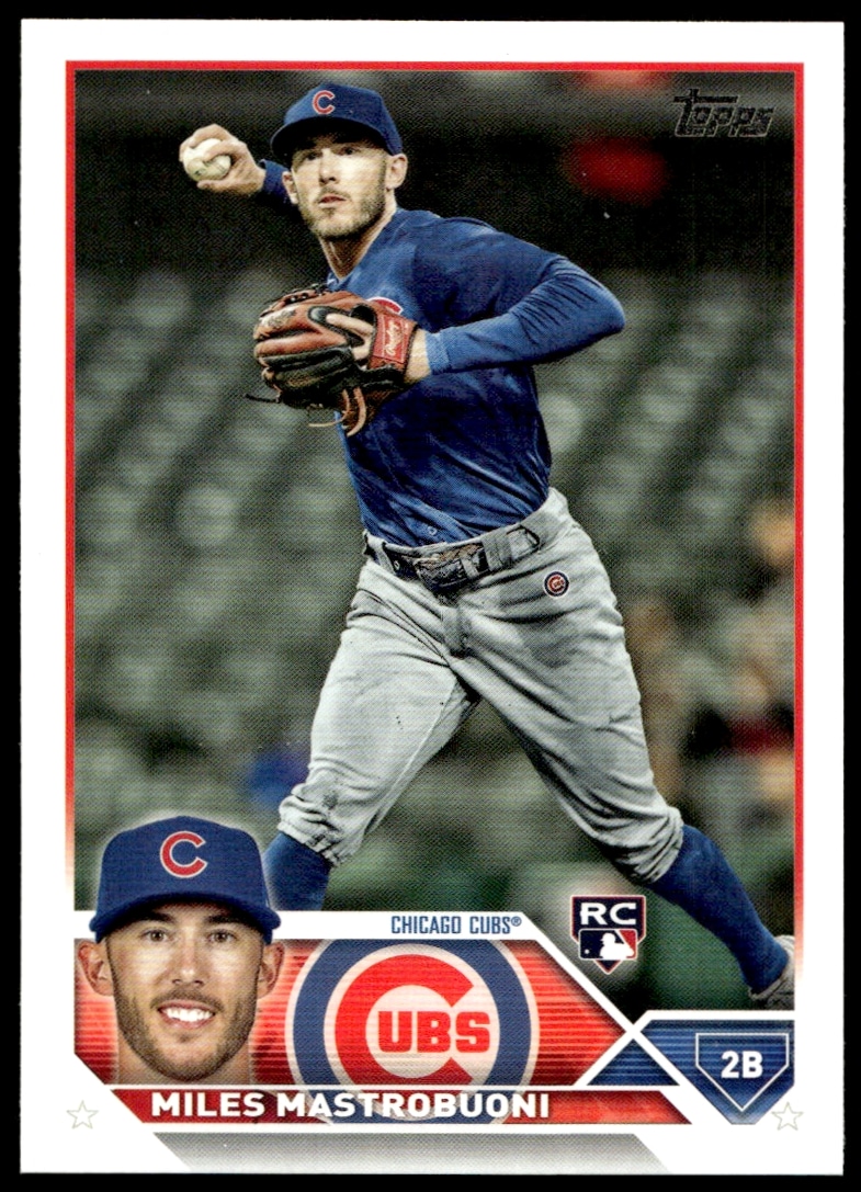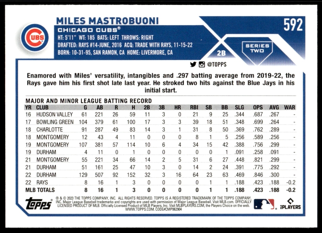 This Baseball card, from 2023 is part of the Topps Series 1 card set. Miles Mastrobuoni is featured and has a card number of 592.