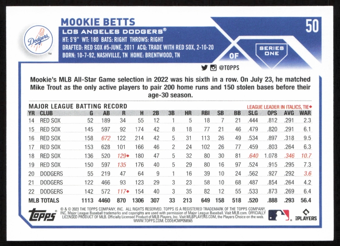 This Baseball card, from 2023 is part of the Topps Series 1 card set. Mookie Betts is featured and has a card number of 50.