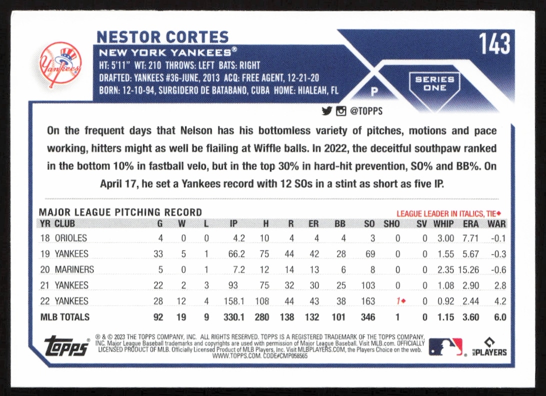 This Baseball card, from 2023 is part of the Topps Series 1 card set. Nestor Cortes is featured and has a card number of 143.