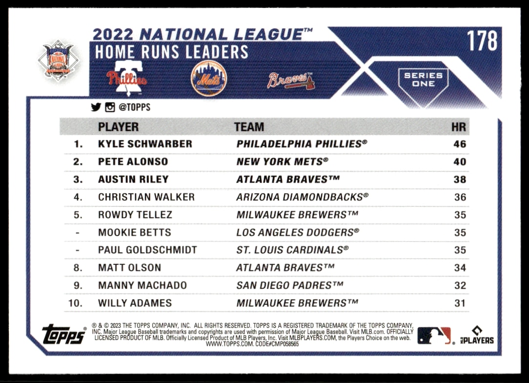 2023 Topps Series 1 NL HRs Leaders: Kyle Schwarber / Pete Alonso / Austin Riley #178