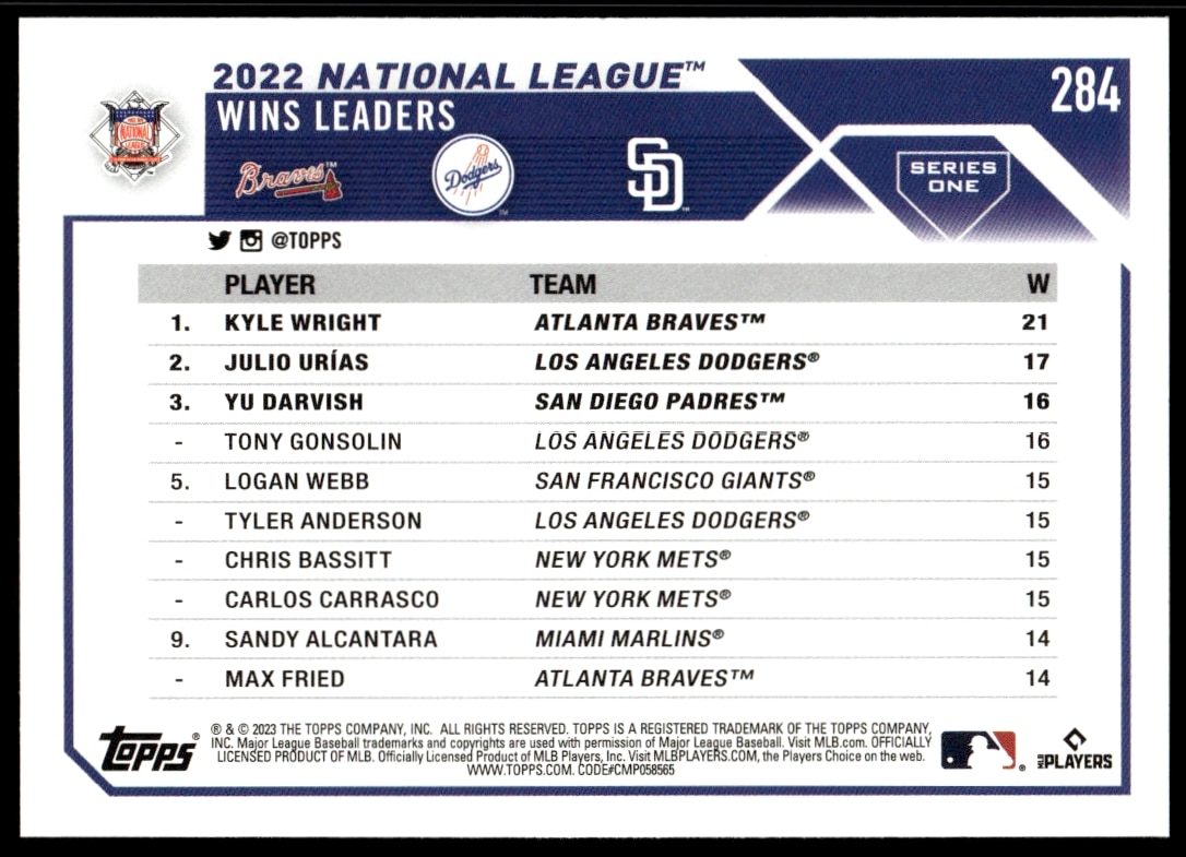 This Baseball card, from 2023 is part of the Topps Series 1 card set. NL Wins Leaders: Kyle Wright / Julio Uri?as / Yu Darvish is featured and has a card number of 284.