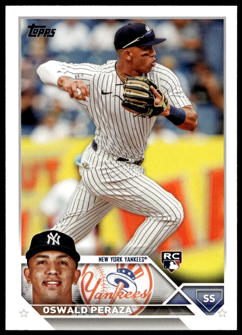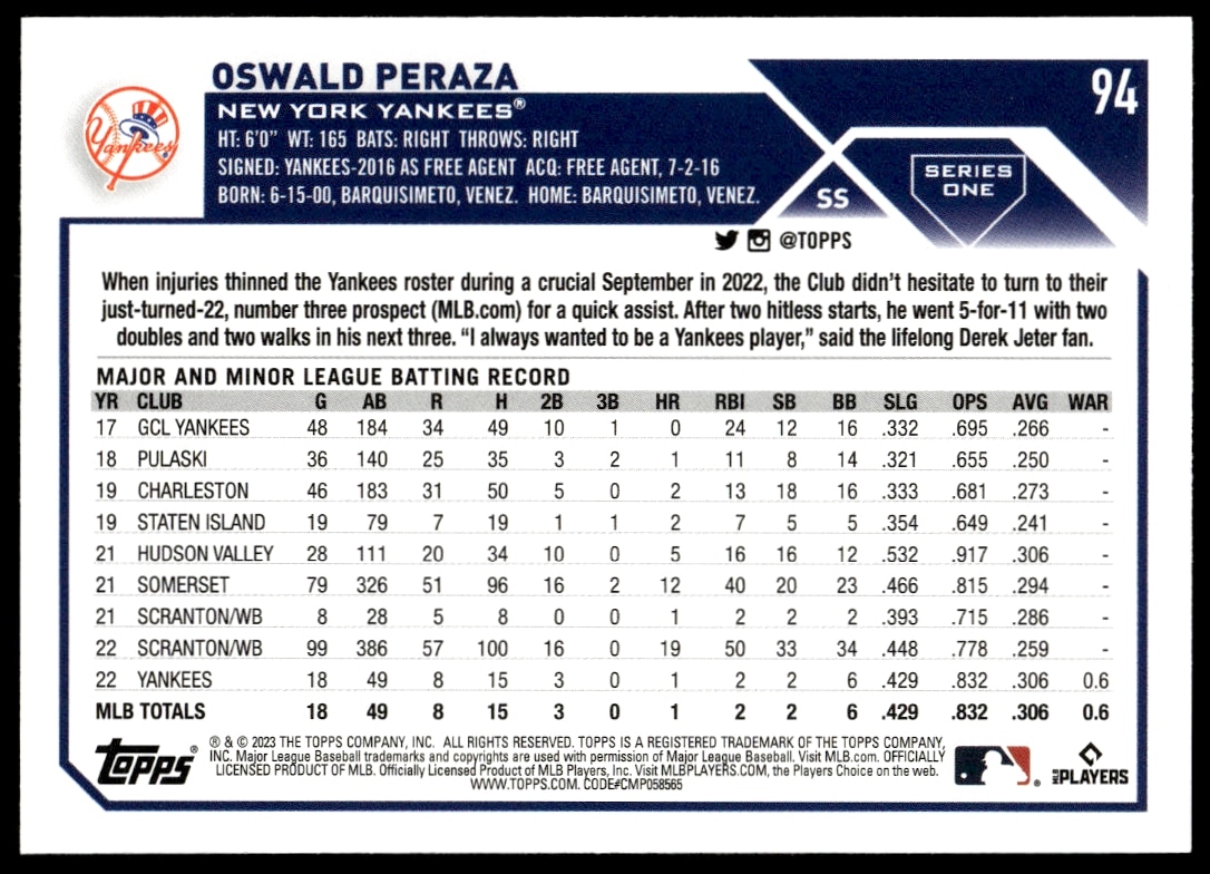 This Baseball card, from 2023 is part of the Topps Series 1 card set. Oswald Peraza is featured and has a card number of 94.