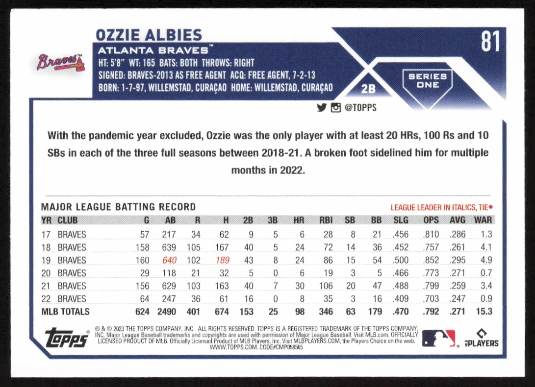 This Baseball card, from 2023 is part of the Topps Series 1 card set. Ozzie Albies is featured and has a card number of 81.