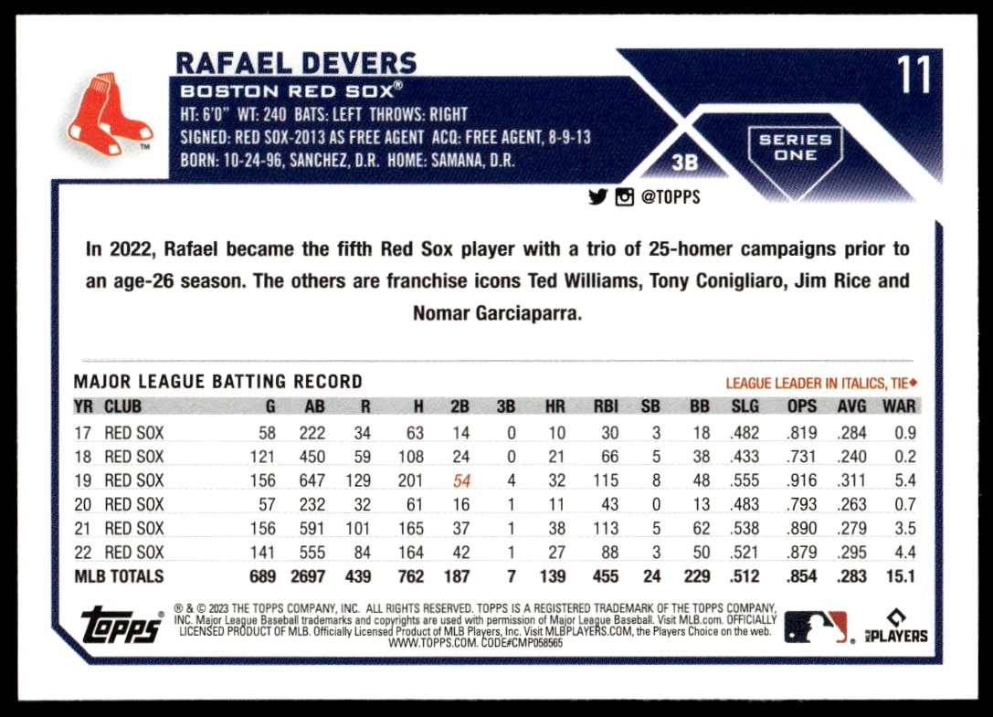 This Baseball card, from 2023 is part of the Topps Series 1 card set. Rafael Devers is featured and has a card number of 11.