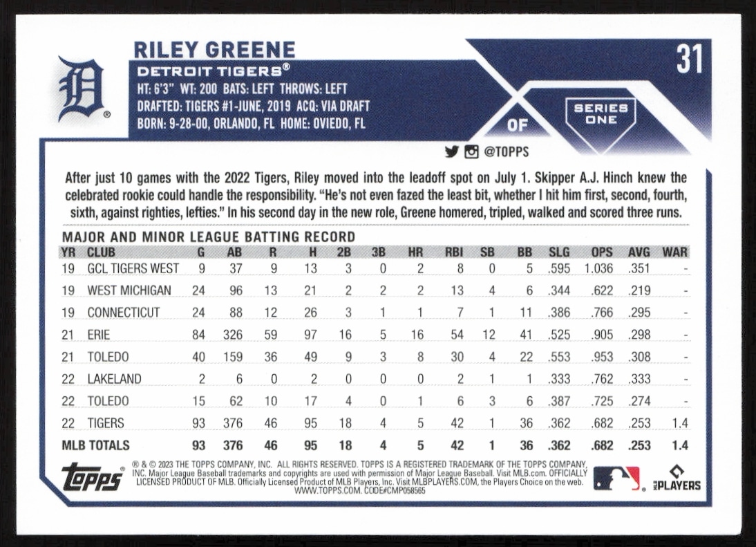 This Baseball card, from 2023 is part of the Topps Series 1 card set. Riley Greene is featured and has a card number of 31.