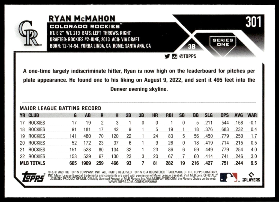 This Baseball card, from 2023 is part of the Topps Series 1 card set. Ryan McMahon is featured and has a card number of 301.
