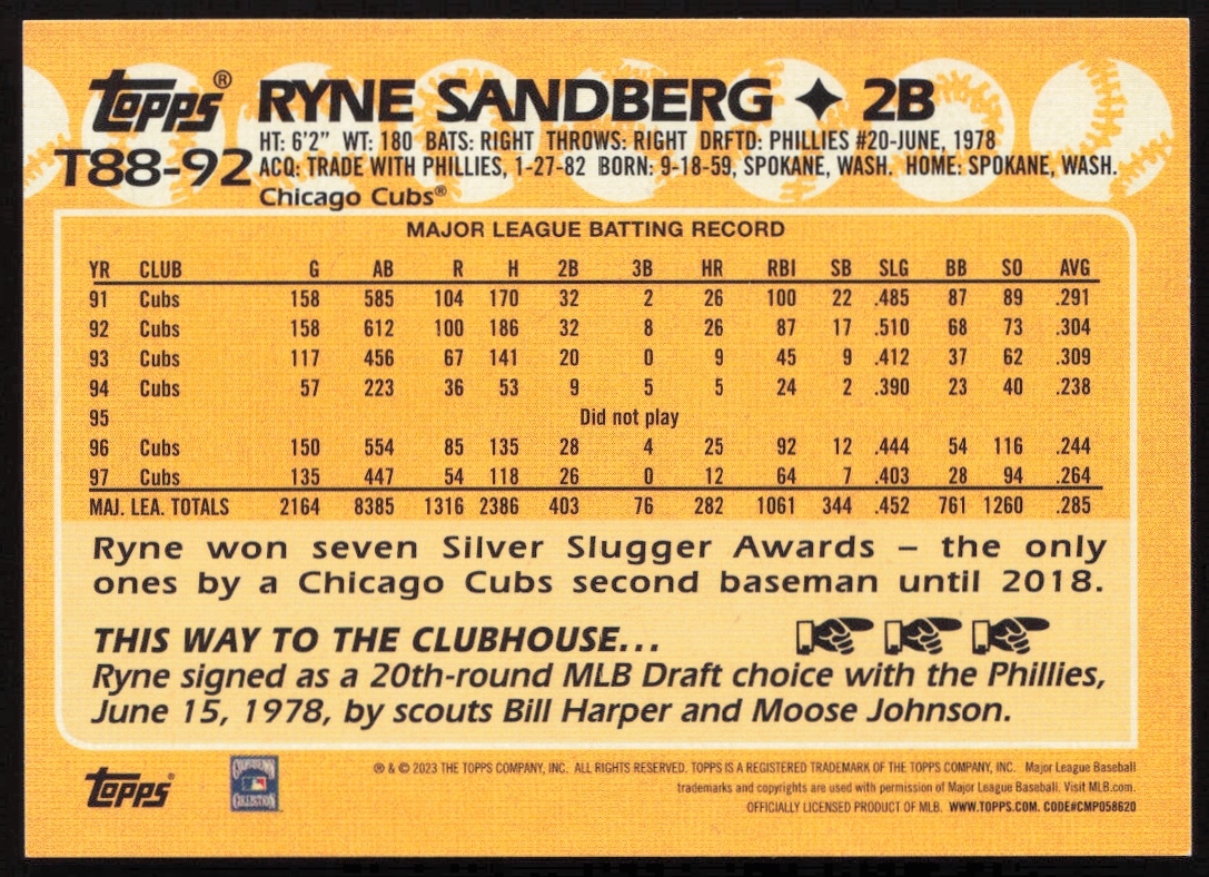 This Baseball card, from 2023 is part of the Topps Series 1 card set. Ryne Sandberg is featured and has a card number of T88-92.