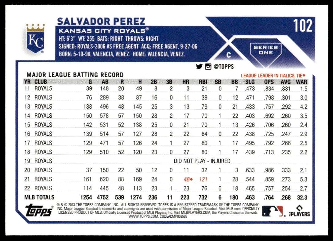 This Baseball card, from 2023 is part of the Topps Series 1 card set. Salvador Perez is featured and has a card number of 102.