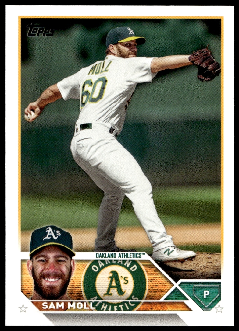 This Baseball card, from 2023 is part of the Topps Series 1 card set. Sam Moll is featured and has a card number of 8.
