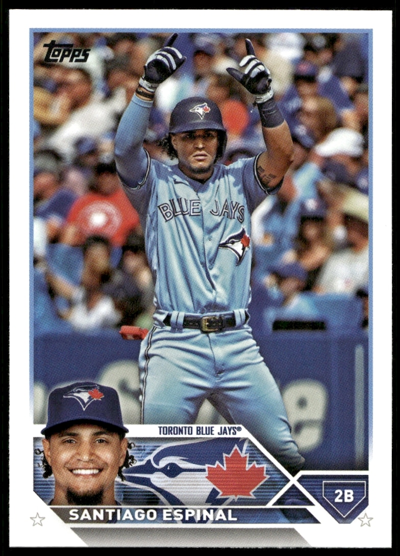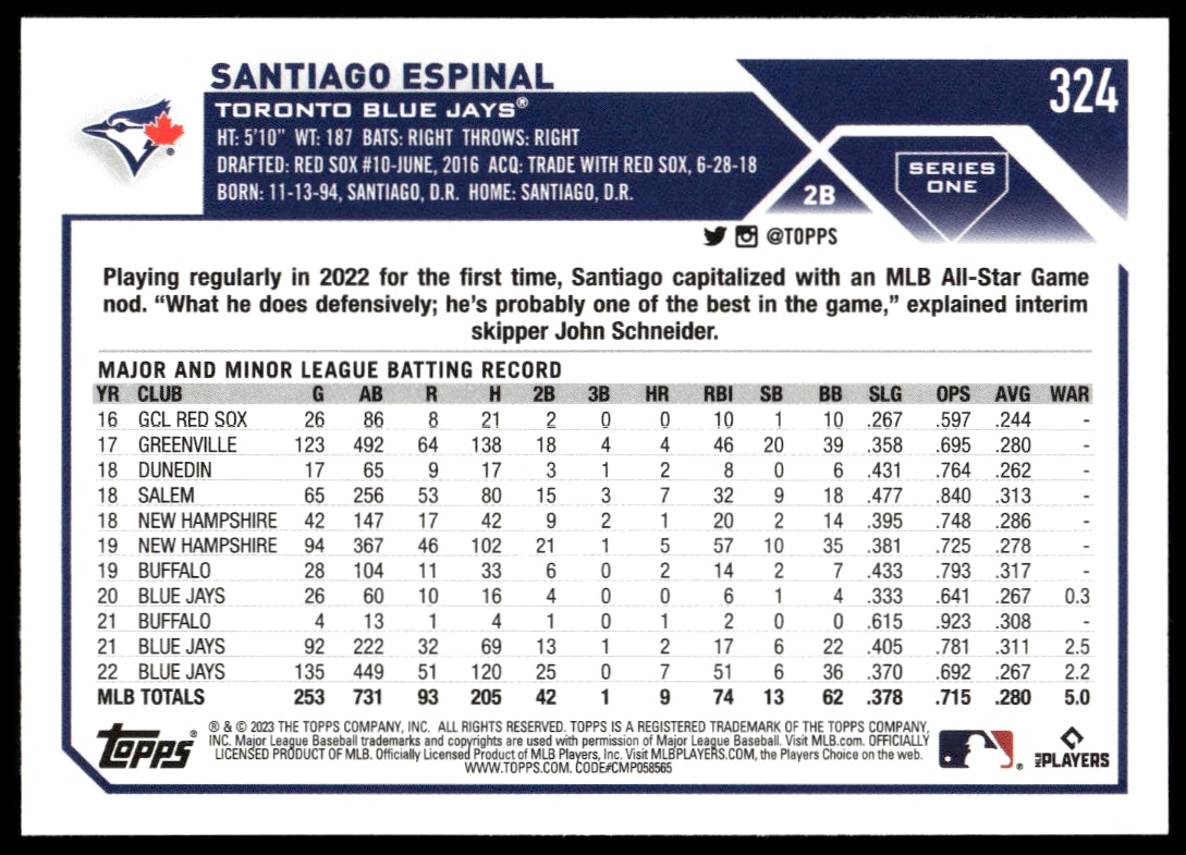 This Baseball card, from 2023 is part of the Topps Series 1 card set. Santiago Espinal is featured and has a card number of 324.