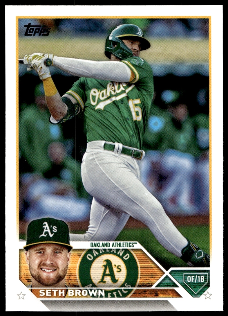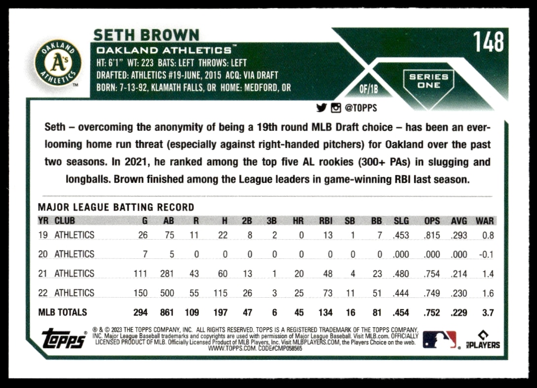 This Baseball card, from 2023 is part of the Topps Series 1 card set. Seth Brown is featured and has a card number of 148.