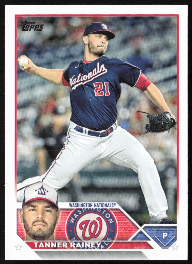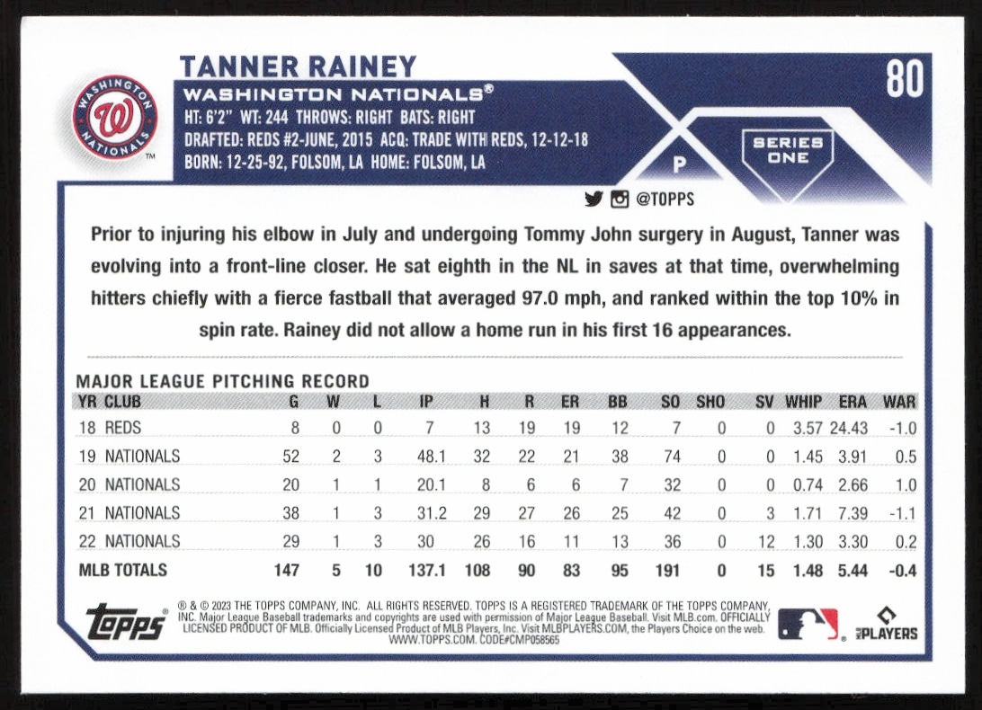This Baseball card, from 2023 is part of the Topps Series 1 card set. Tanner Rainey is featured and has a card number of 80.