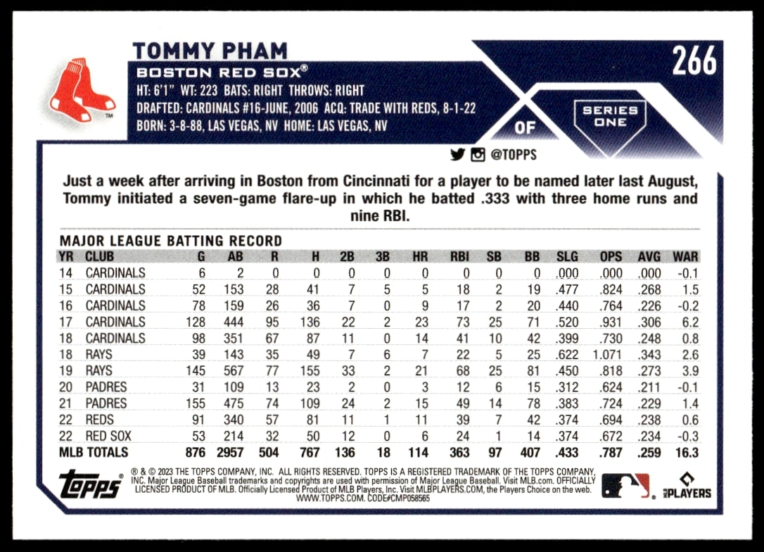 This Baseball card, from 2023 is part of the Topps Series 1 card set. Tommy Pham is featured and has a card number of 266.