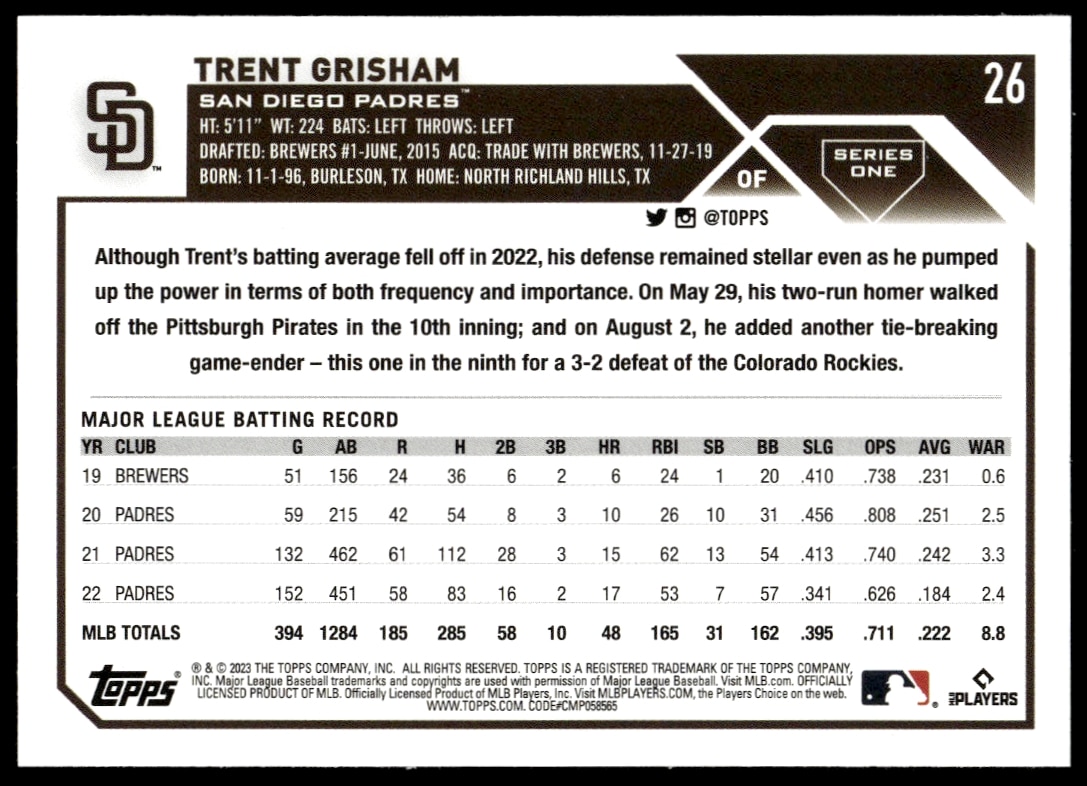 This Baseball card, from 2023 is part of the Topps Series 1 card set. Trent Grisham is featured and has a card number of 26.
