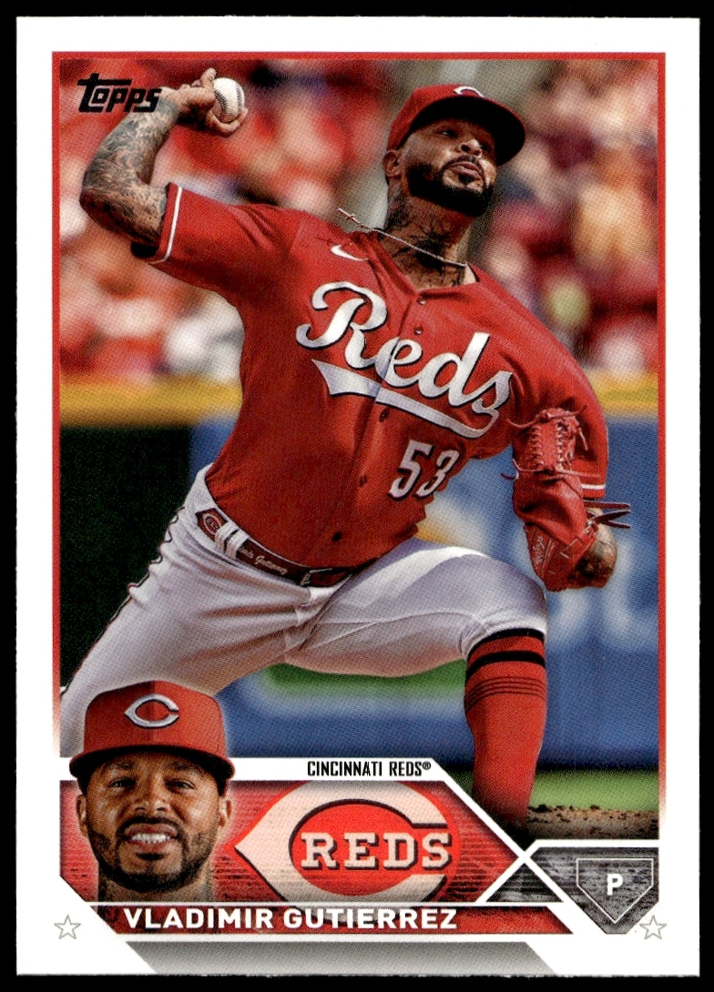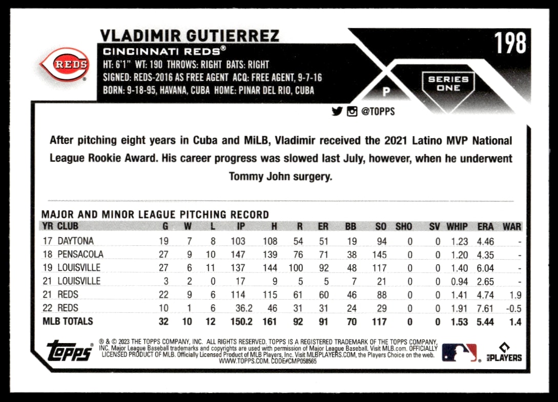 This Baseball card, from 2023 is part of the Topps Series 1 card set. Vladimir Gutierrez is featured and has a card number of 198.