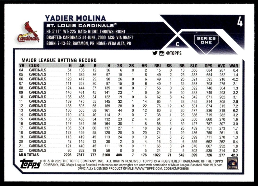 This Baseball card, from 2023 is part of the Topps Series 1 card set. Yadier Molina is featured and has a card number of 4.