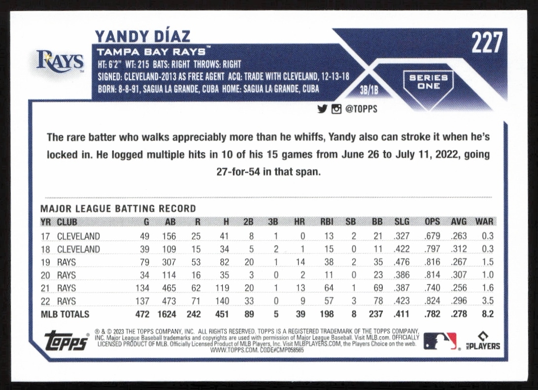 This Baseball card, from 2023 is part of the Topps Series 1 card set. Yandy Diaz is featured and has a card number of 227.