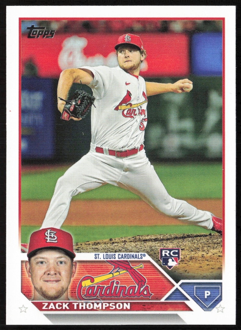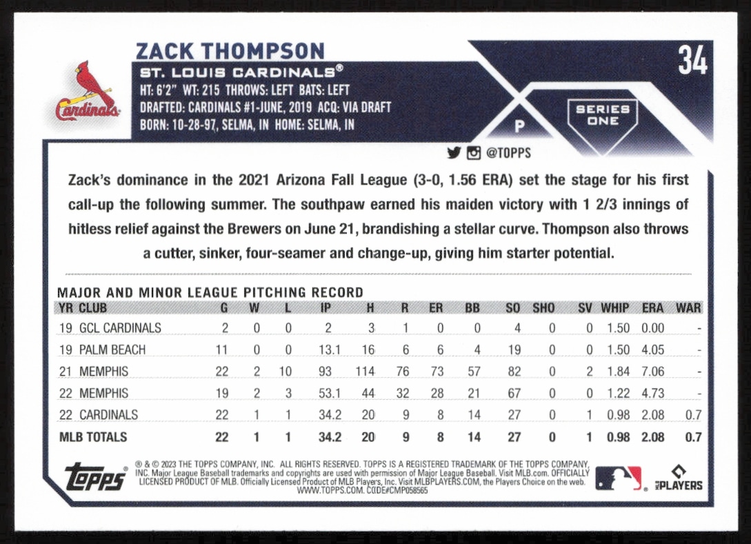 This Baseball card, from 2023 is part of the Topps Series 1 card set. Zack Thompson is featured and has a card number of 34.