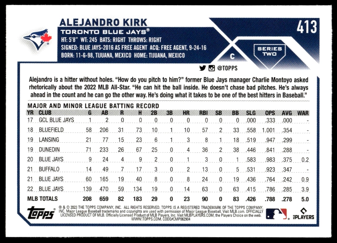 This Baseball card, from 2023 is part of the Topps Series 2 card set. Alejandro Kirk is featured and has a card number of 413.