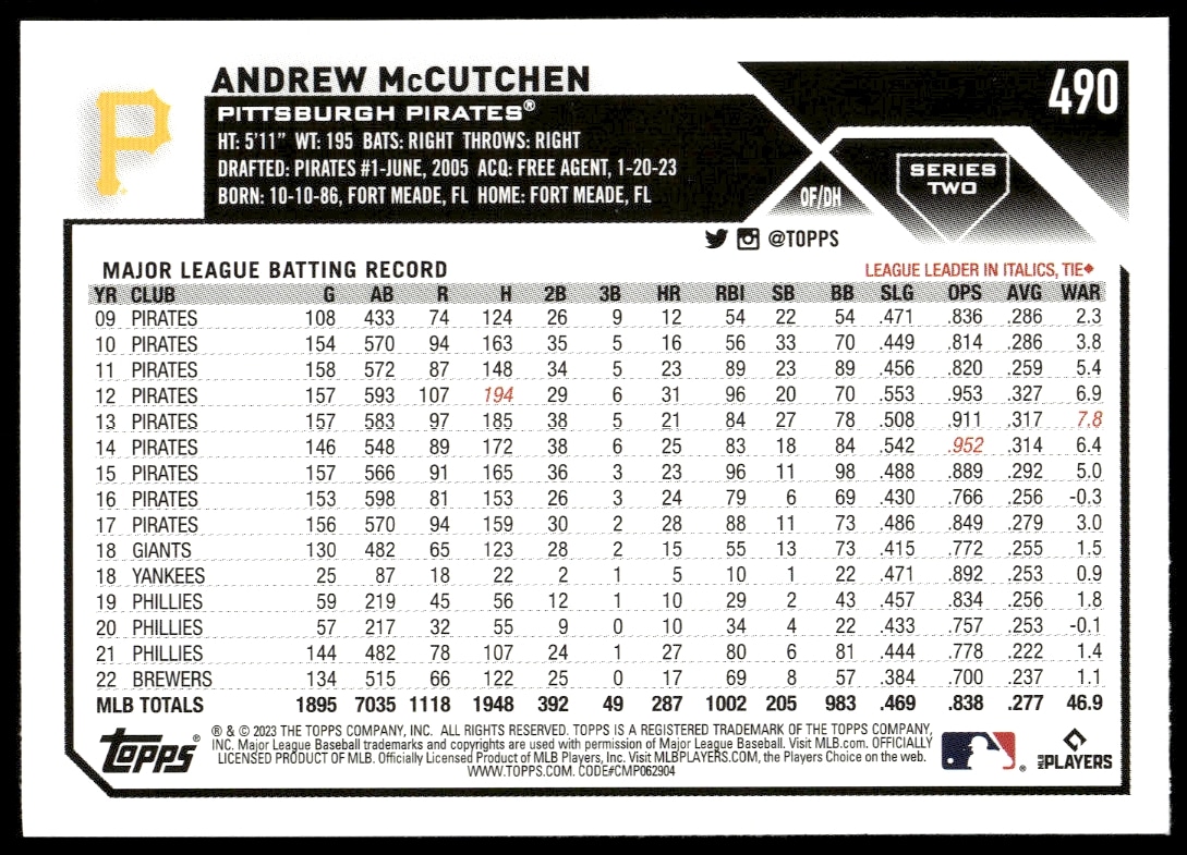 This Baseball card, from 2023 is part of the Topps Series 2 card set. Andrew McCutchen is featured and has a card number of 490.