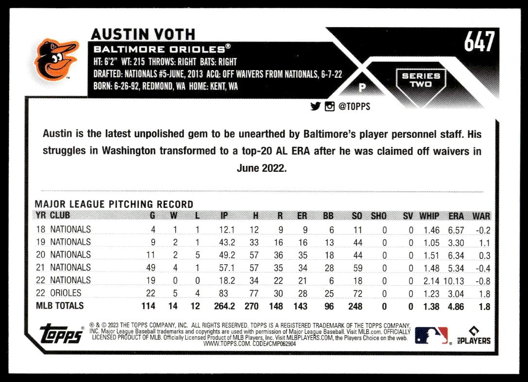 This Baseball card, from 2023 is part of the Topps Series 2 card set. Austin Voth is featured and has a card number of 647.