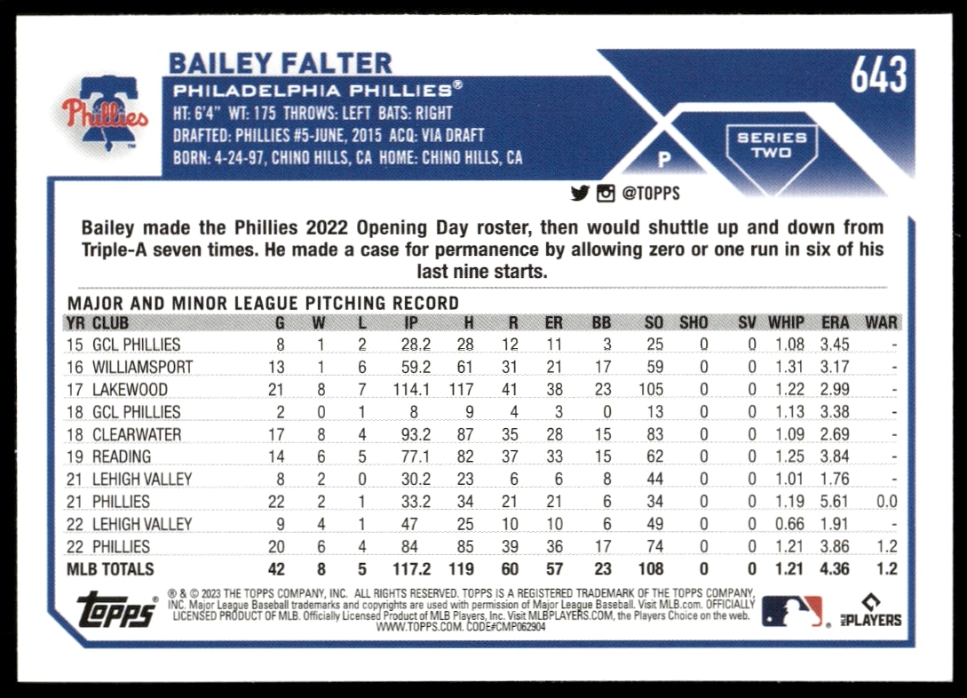 This Baseball card, from 2023 is part of the Topps Series 2 card set. Bailey Falter is featured and has a card number of 643.