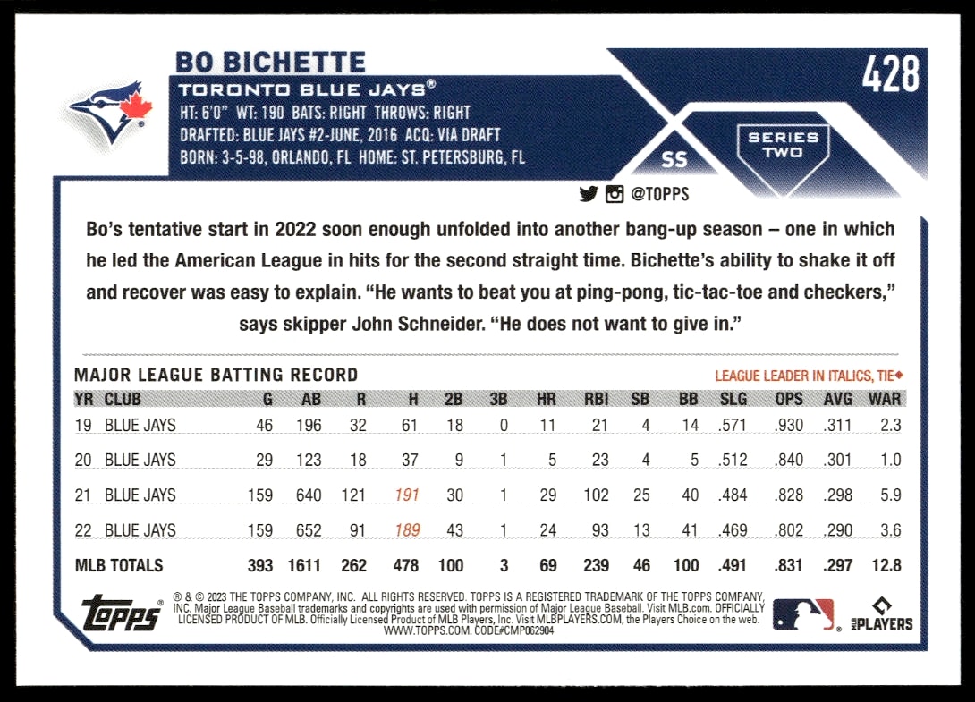 This BaseballΒ card, from 2023 is part of the Topps Series 2Β card set. Bo Bichette is featured and has a card number of 428.