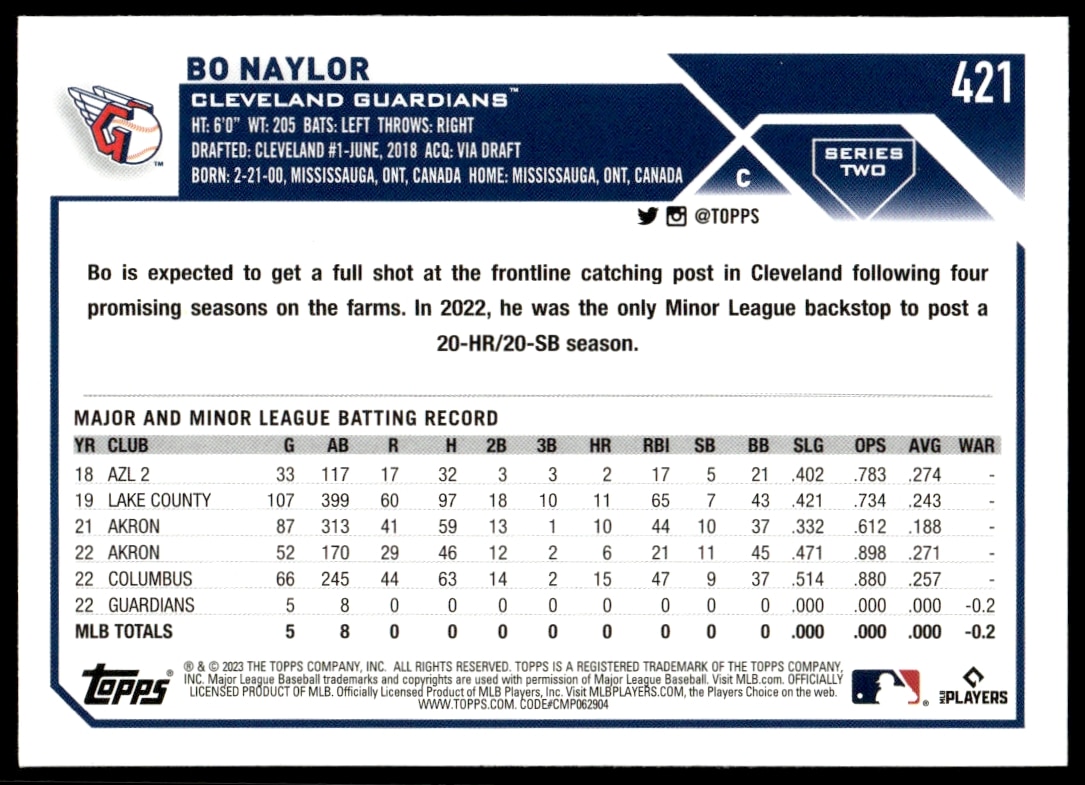 This Baseball card, from 2023 is part of the Topps Series 2 card set. Bo Naylor is featured and has a card number of 421.