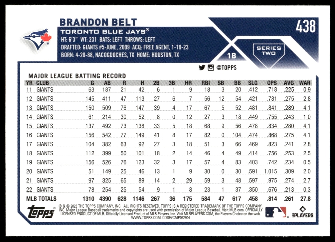This BaseballΒ card, from 2023 is part of the Topps Series 2Β card set. Brandon Belt is featured and has a card number of 438.
