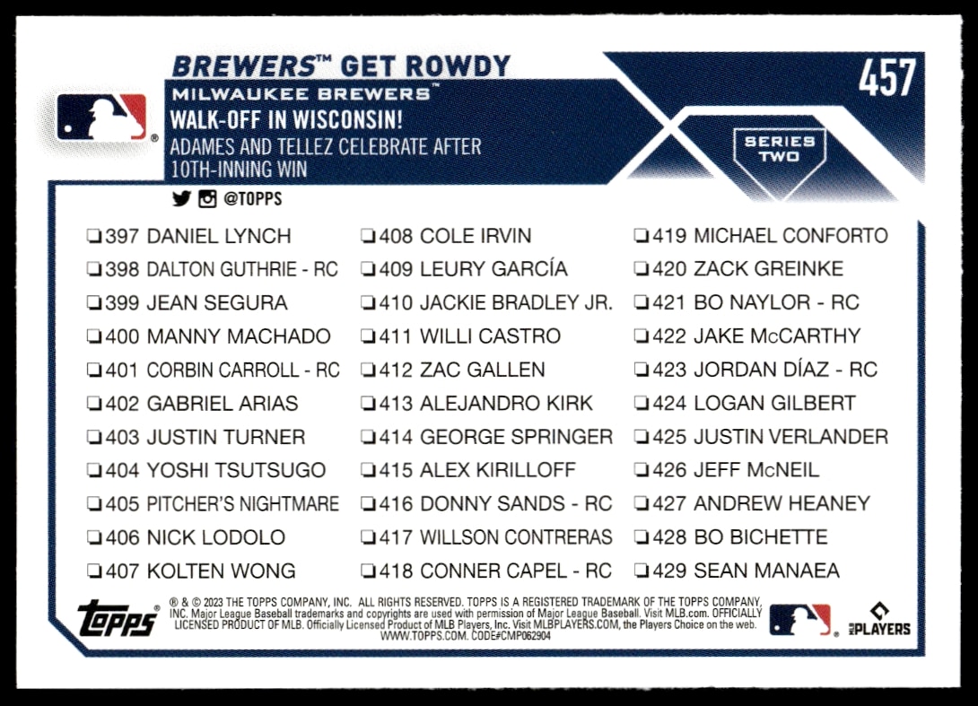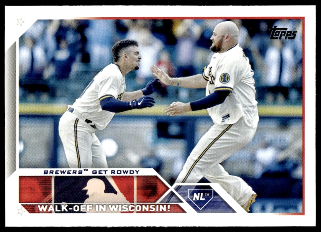 This Baseball card, from 2023 is part of the Topps Series 2 card set. Brewers Get Rowdy is featured and has a card number of 457.