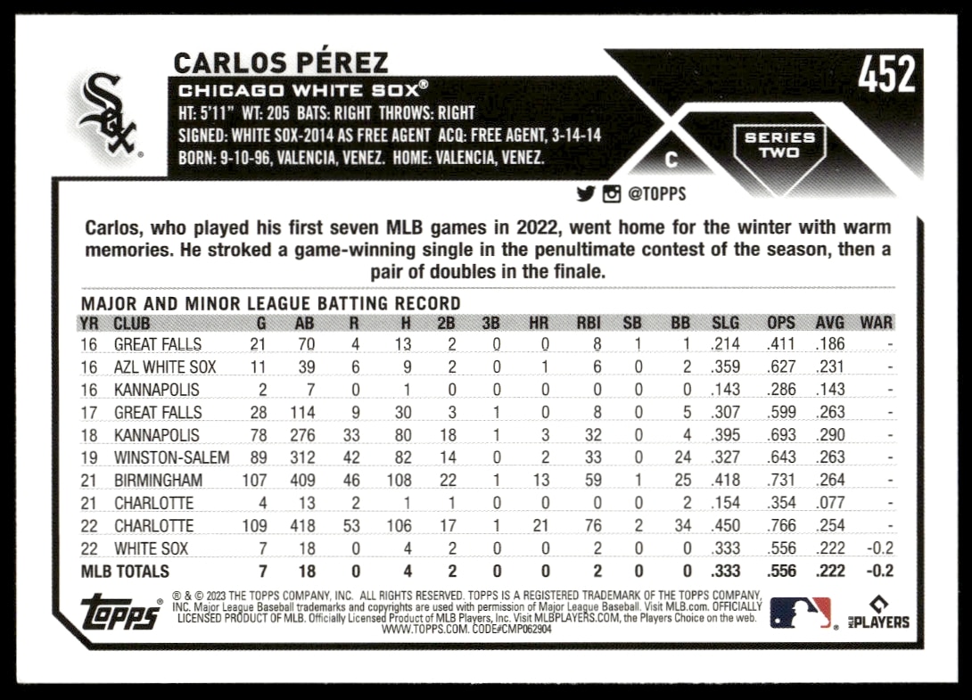 This Baseball card, from 2023 is part of the Topps Series 2 card set. Carlos Perez is featured and has a card number of 452.